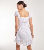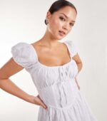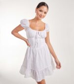 A short embroidered white cotton dress with a corset-style waist, puff cap sleeves, and a tie front—fully lined and full of charm.